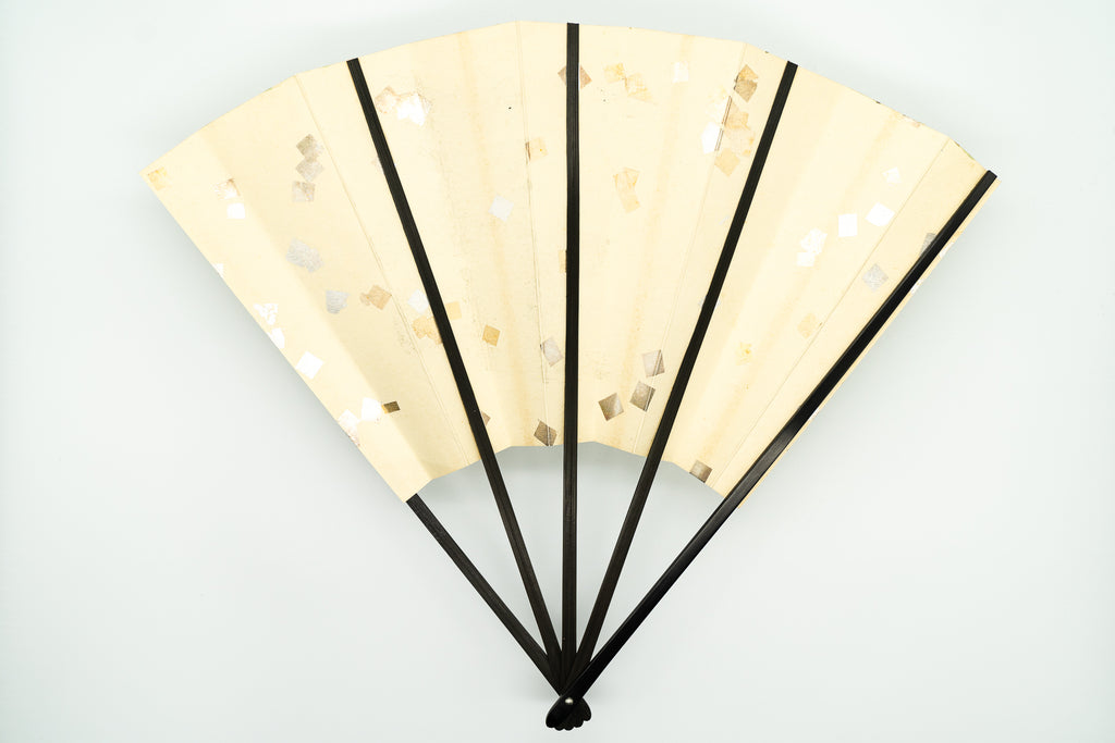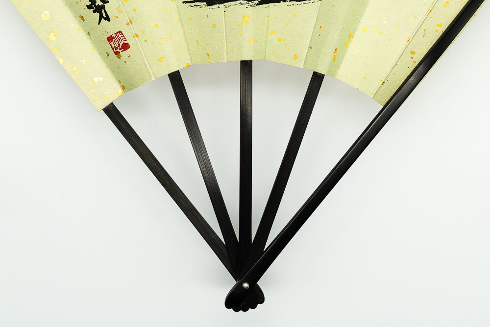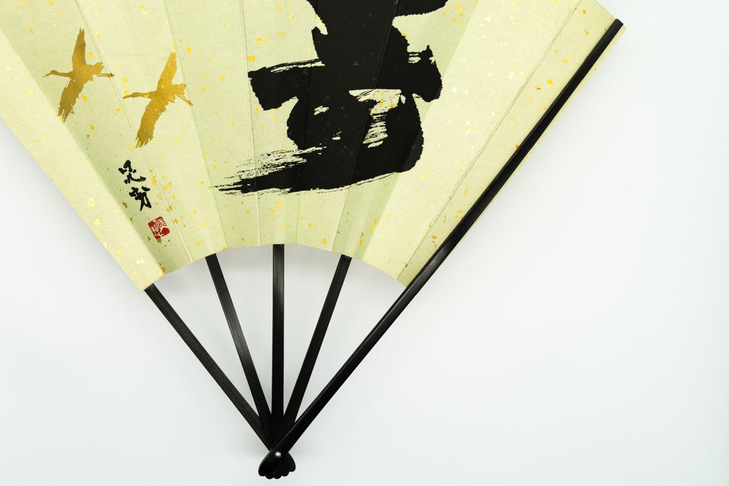 【ビンテージ品】蝙蝙蝠扇は平安時代に生まれ、古くは紙扇・紙張り扇の総称でした。扇を開いた形がコウモリの羽に似ているからとも言われています。フォルムが美しく、インテリアに取入れやすいちょうど良いサイズでおしゃれに飾っていただけます。こちらは金砂子地の扇面に黒文字で寿と金の鶴が描かれています。