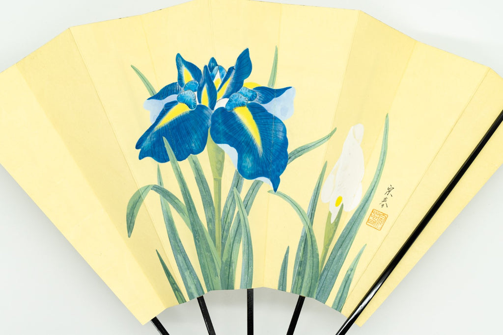 【一点もの】蝙蝙蝠扇は平安時代に生まれ、古くは紙扇・紙張り扇の総称でした。扇を開いた形がコウモリの羽に似ているからとも言われています。フォルムが美しく、インテリアに取入れやすいちょうど良いサイズでおしゃれに飾っていただけます。こちらは鳥の子地の扇面に手描きであやめが大きく描かれています。青のお色味がシックで落ち着いた雰囲気を醸し出しています。