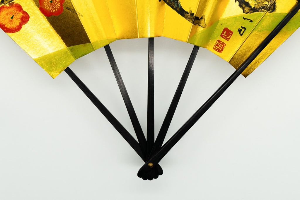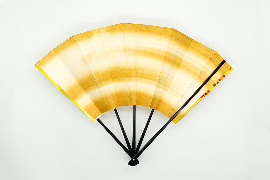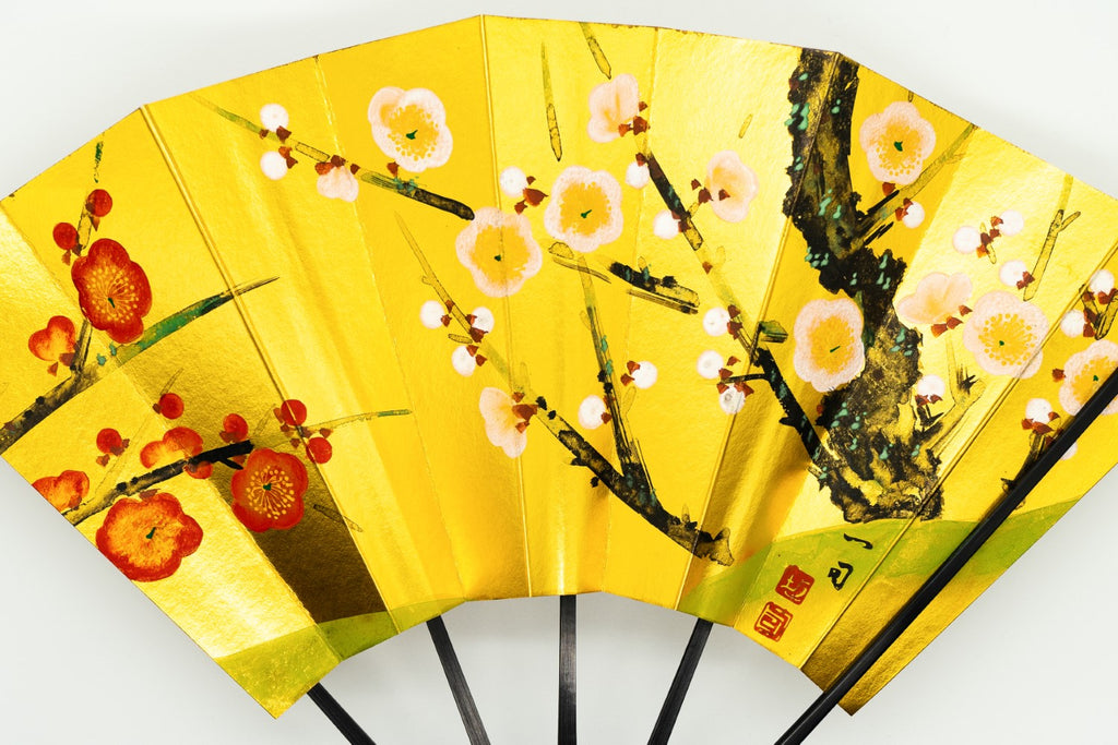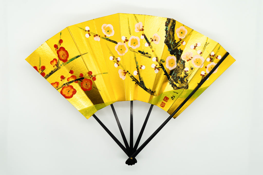 蝙蝙蝠扇は平安時代に生まれ、古くは紙扇・紙張り扇の総称でした。扇を開いた形がコウモリの羽に似ているからとも言われています。フォルムが美しく、インテリアに取入れやすいちょうど良いサイズでおしゃれに飾っていただけます。こちらは金箔地の扇面に手描きで紅白梅が描かれており、華やかな雰囲気が楽しめる一品です。