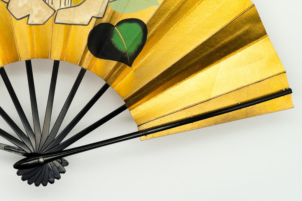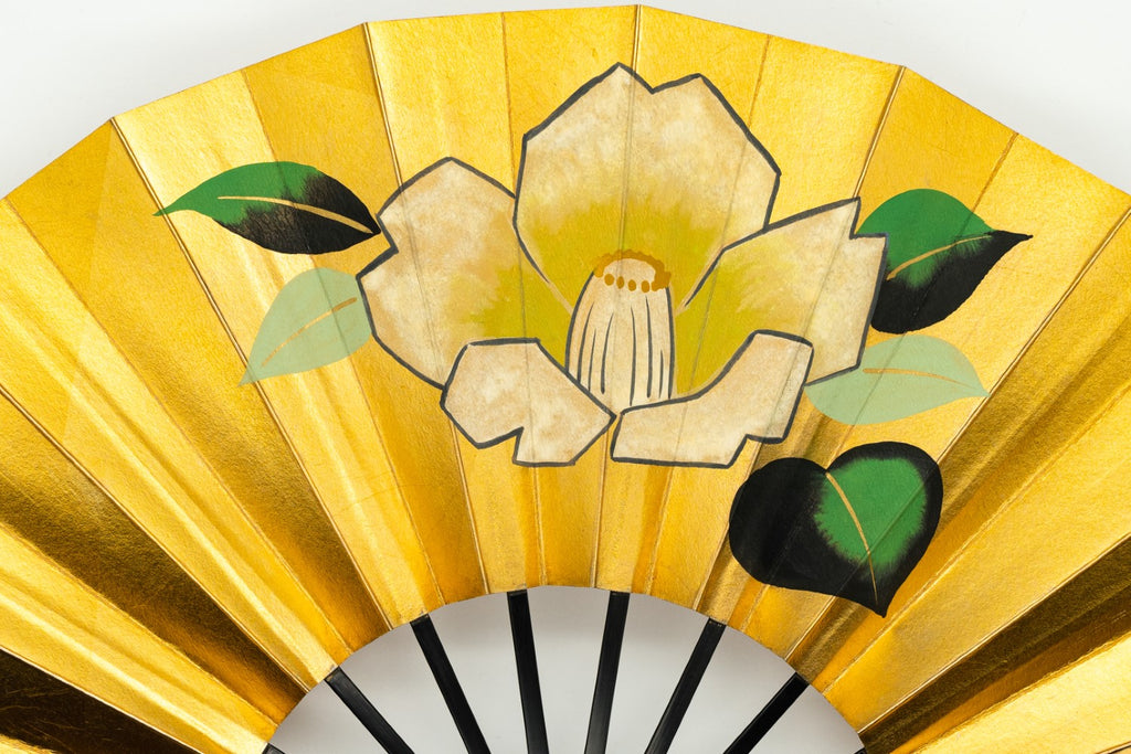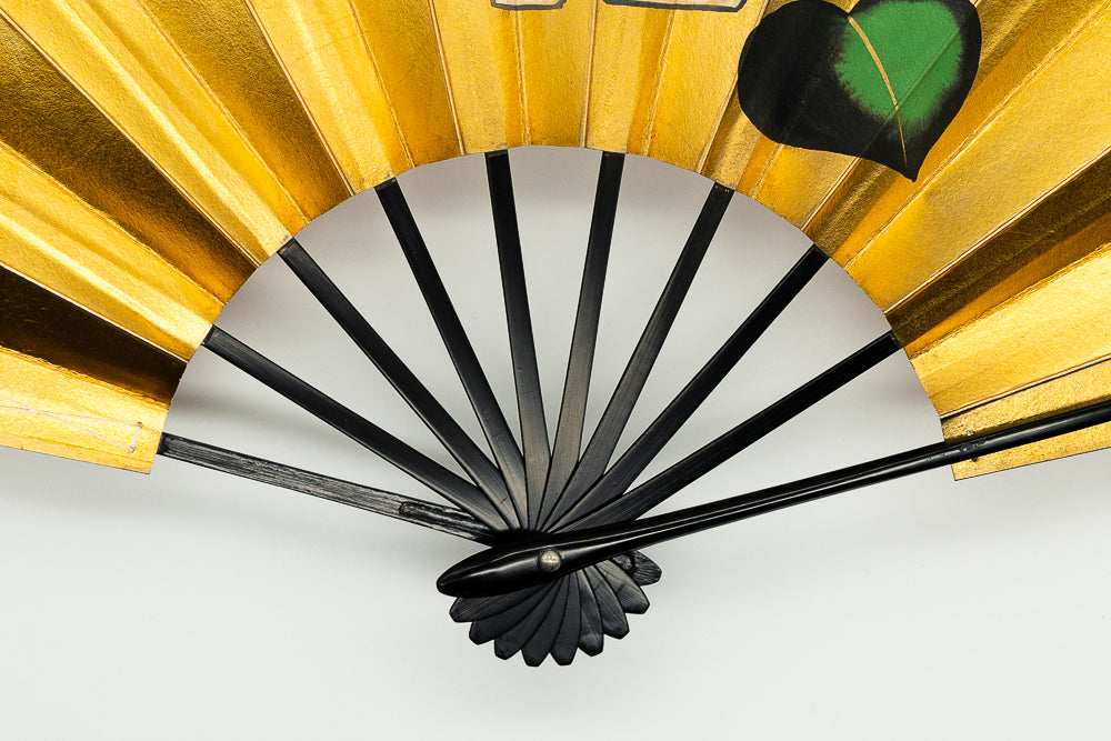 【一点もの・ビンテージ品】上質な金箔地の扇面に片面には落ち着いた雰囲気の椿、片面には紅葉が一面に描かれており華やかです。お好みに合わせて両面お使いいただけます。