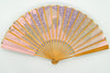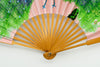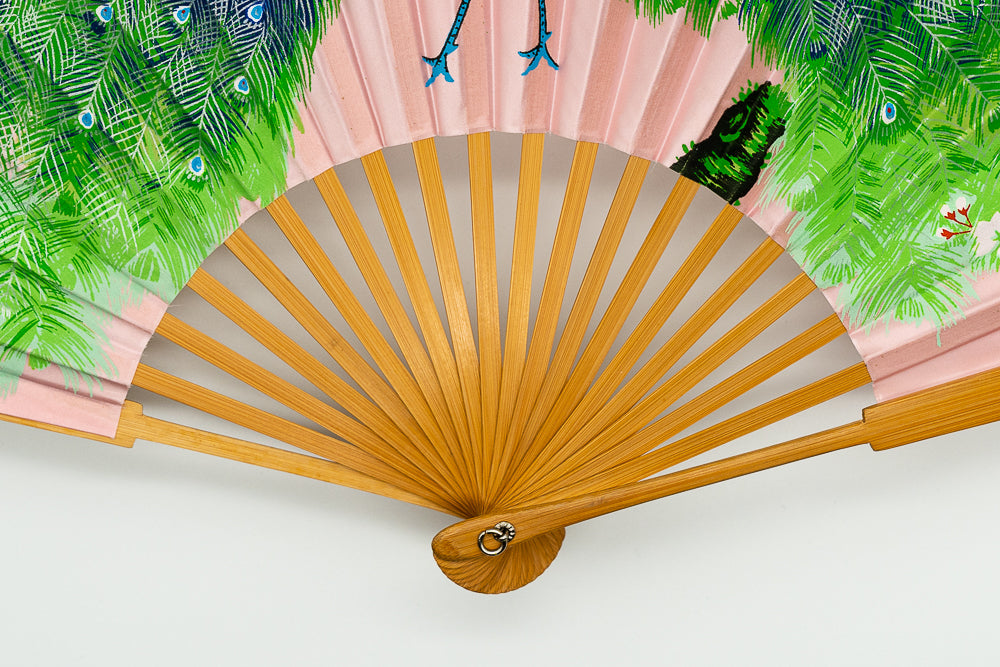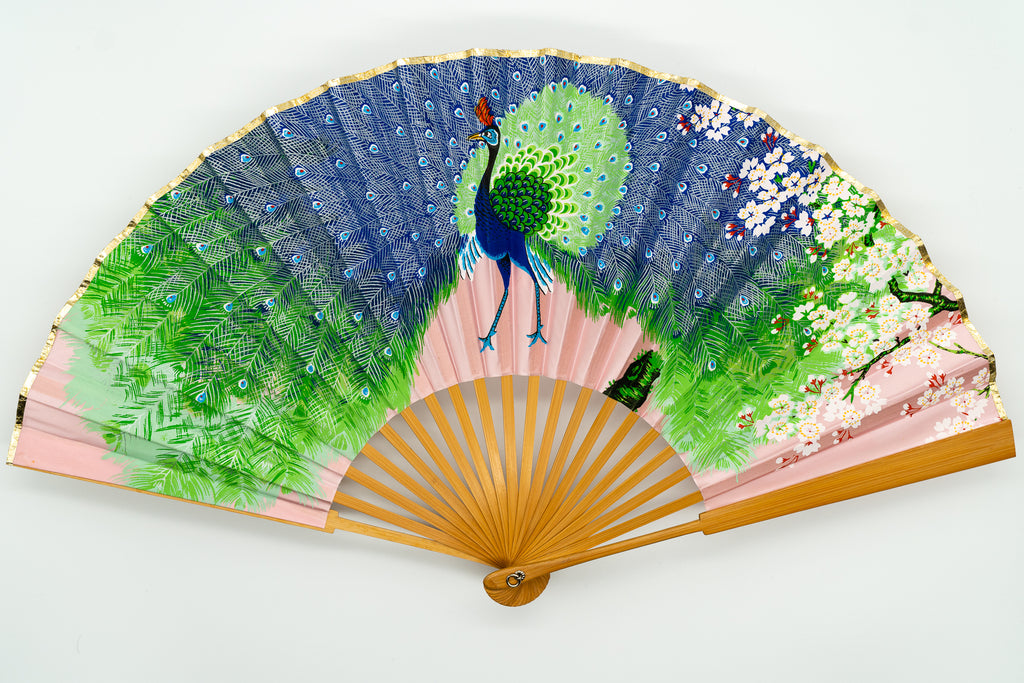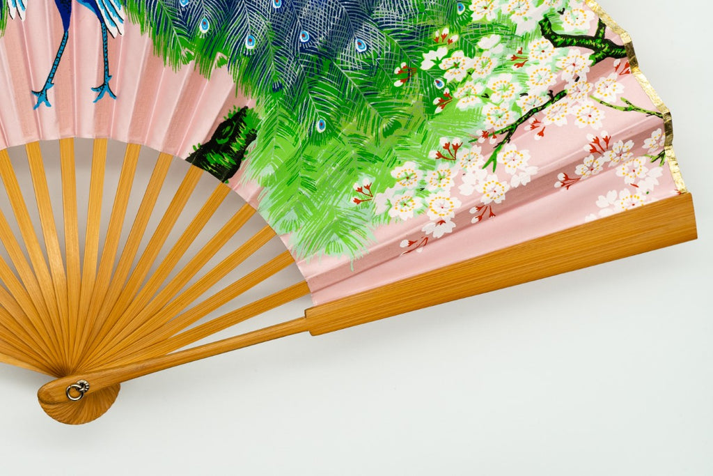 【一点もの・ビンテージ品】絹地の扇面全体に孔雀の羽が描かれています。桜の絵柄と絹地の優しいピンク色が全体を柔らかな雰囲気に仕上げています。