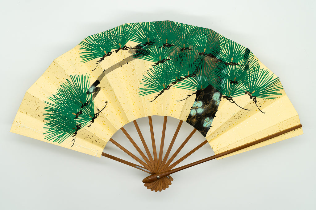 鳥の子地の扇面に一面金砂子振り、手描きで松が描かれています。