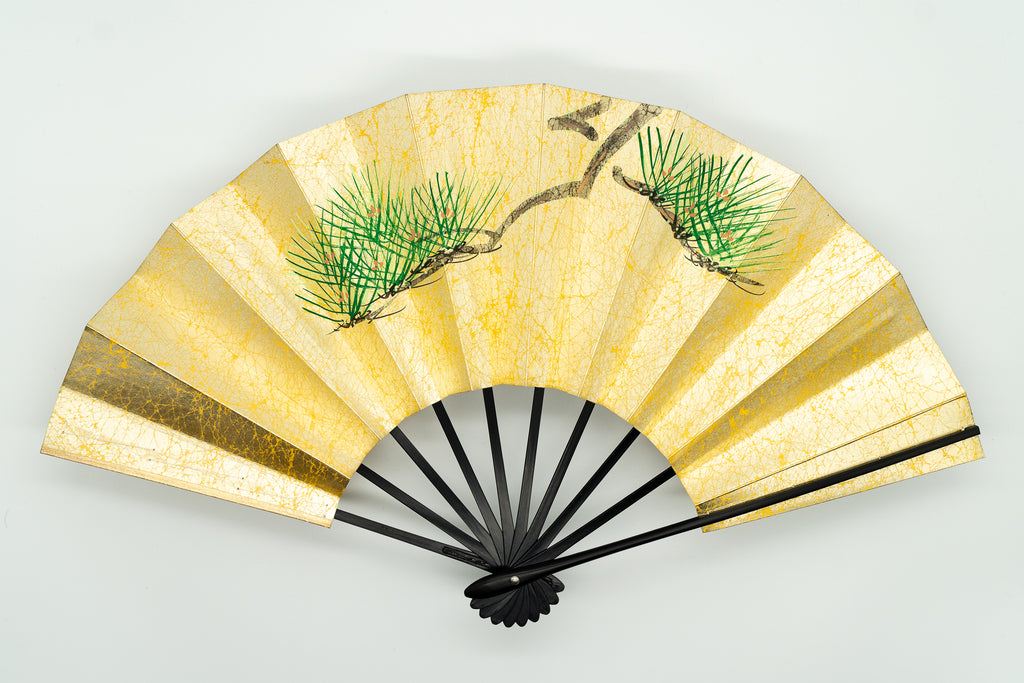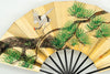 【ビンテージ】上質な金もみ地の扇面に片面には鶴と松、片面には枝松が手描きで描かれており優美な雰囲気です。お好みに合わせて両面、幅広い用途でお使いいただけます。