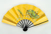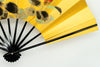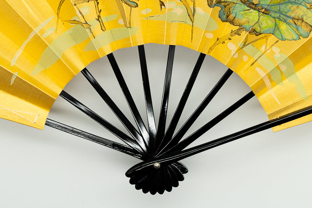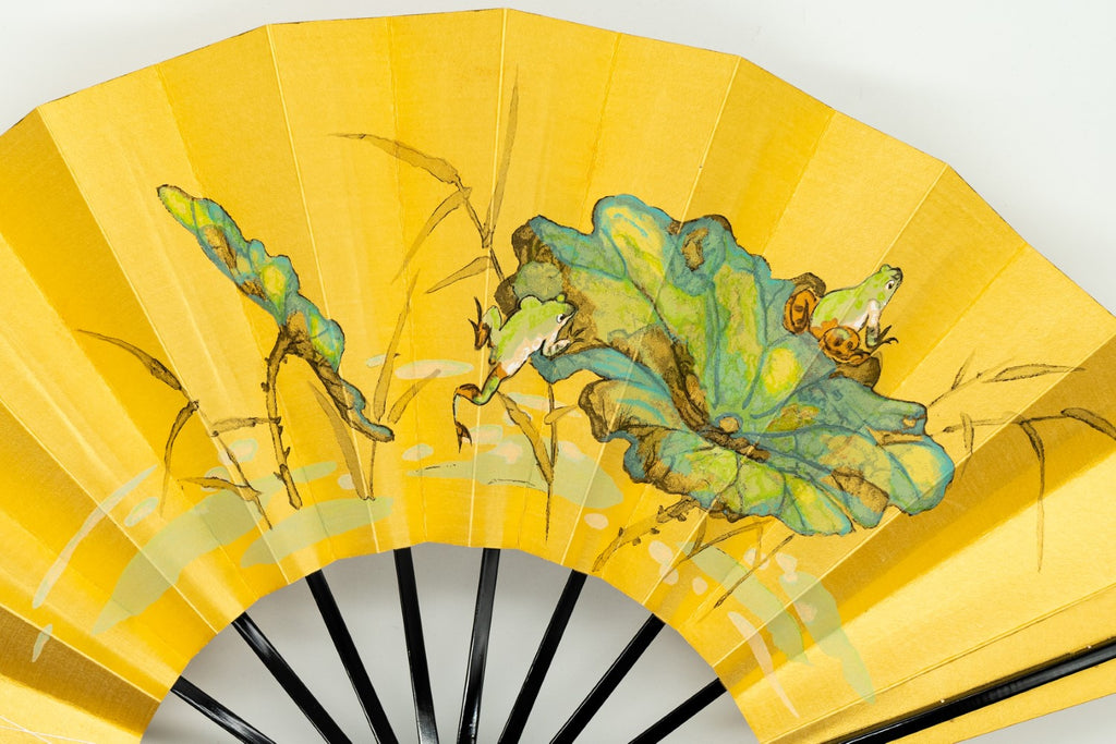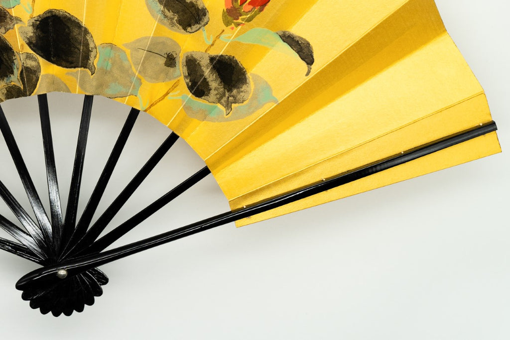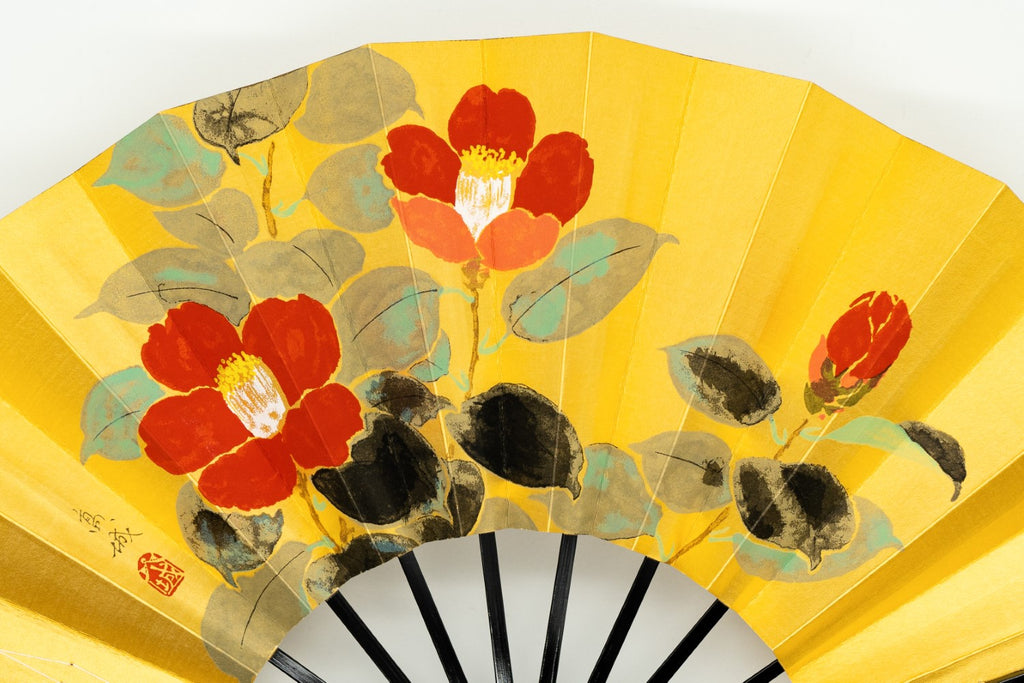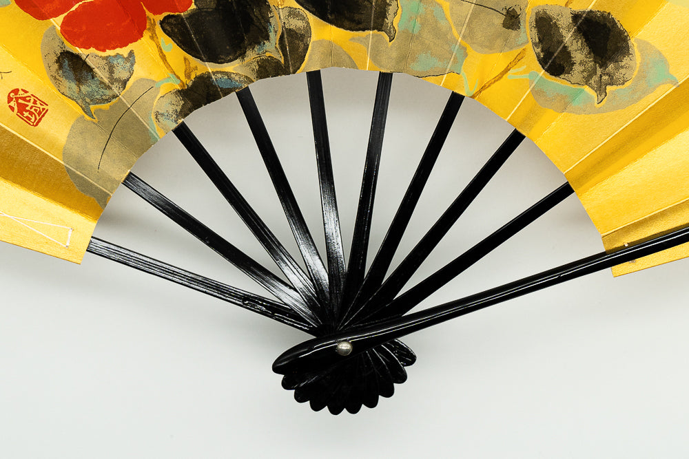 ゴールド地の扇面に片面には鮮やかな赤い椿、片面には蛙と蓮の葉が手描きで描かれています。季節に合わせて両面お使いいただけます。