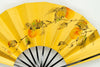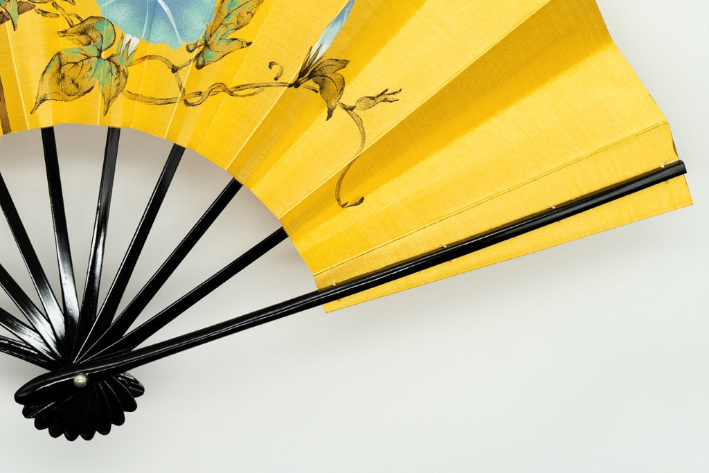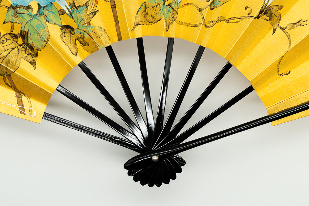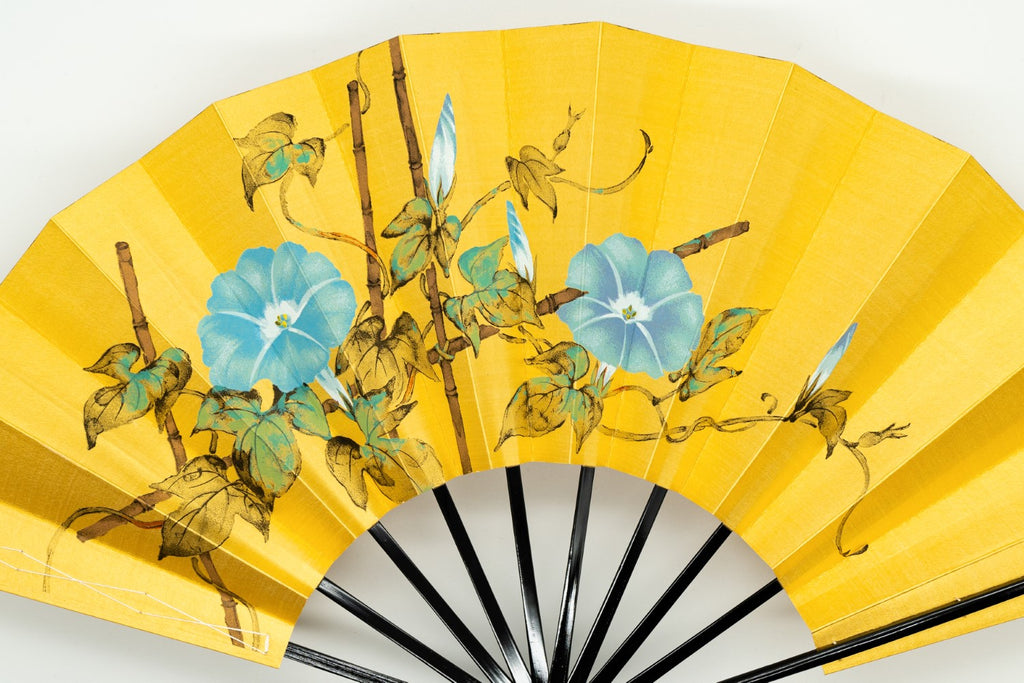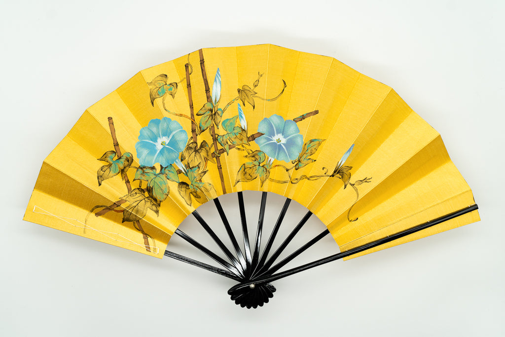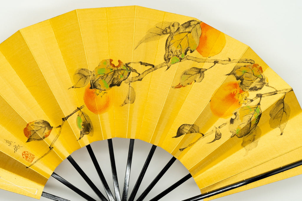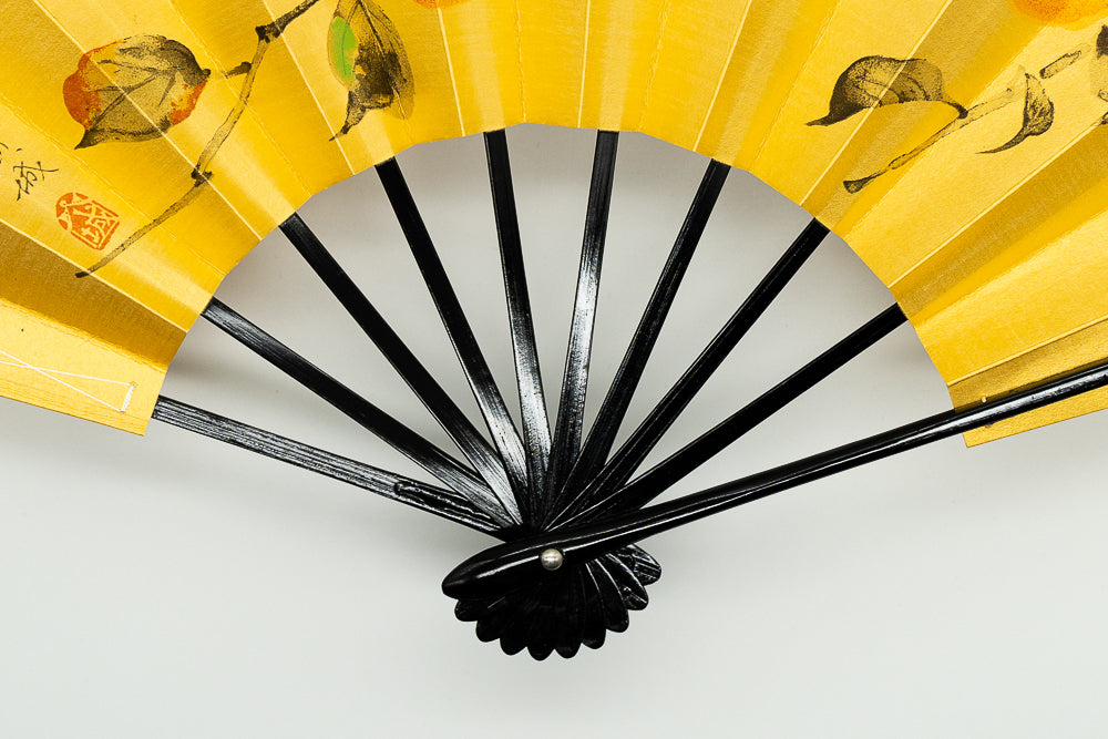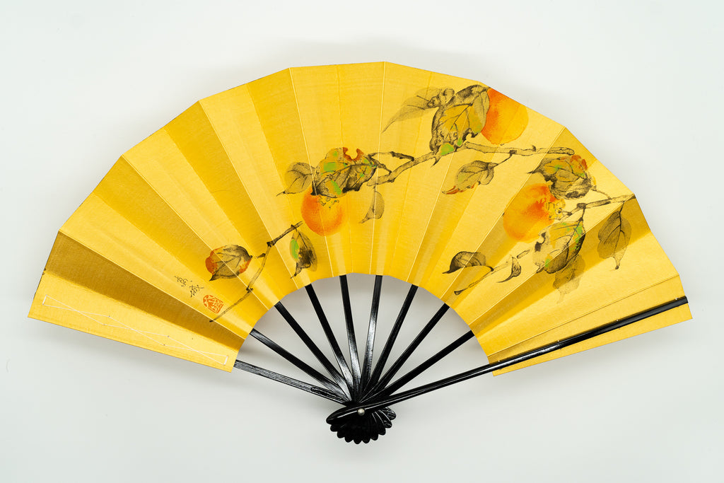 ゴールド地の扇面に片面には水色の朝顔、片面には柿が手描きで描かれています。落ち着いた色調でシックな雰囲気です。季節に合わせて両面お使いいただけます。