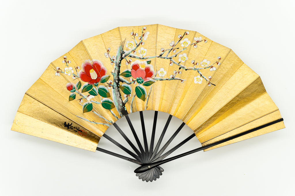 【一点もの・ビンテージ品】金箔を手で揉みこんで扇面に箔押した金もみ地に雪椿が手描きで描かれています。雪と白梅が可愛らしい椿の美しさを引き立たせています。もう片面には白と紫の桔梗が描かれています。用途に応じて両面お使い頂けます。ゴールドが経年変化によりシックなお色味になっており、ビンテージ品らしい趣を楽しんで頂ける一品です。