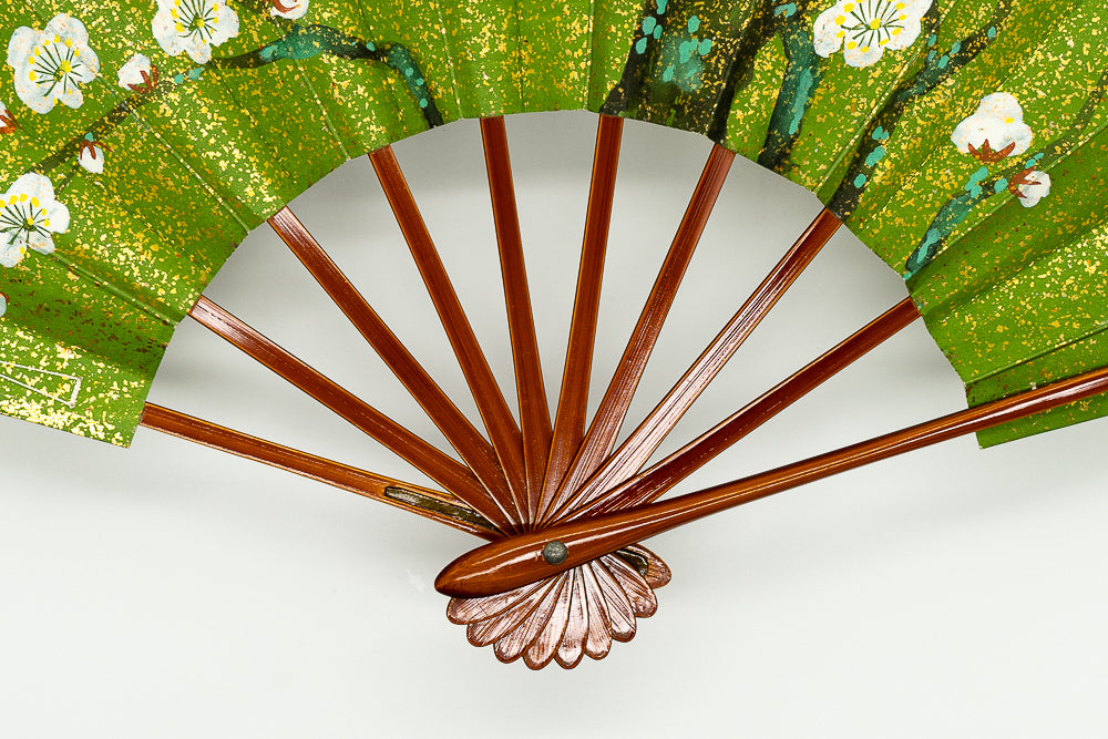 一面金砂子の地紙に松、もう片面には白梅が手描きで描かれています。金砂子と墨絵の松の調和が美しく、白梅は花びらが浮き立つように表現されています。春慶塗りの骨が上品にマッチして扇面のデザインを引き立たせています。