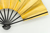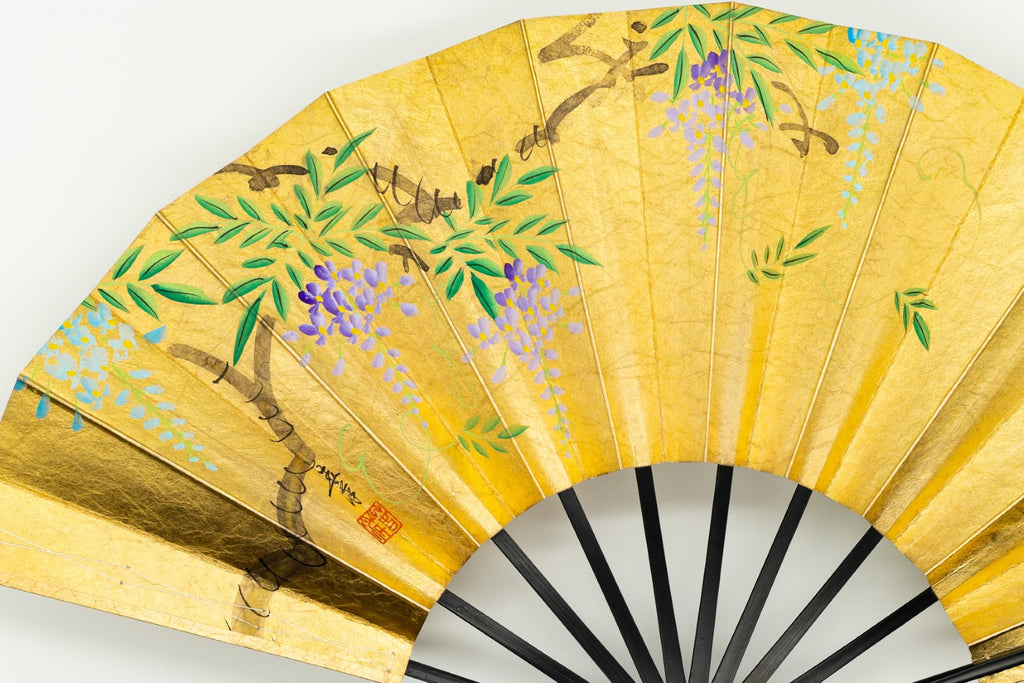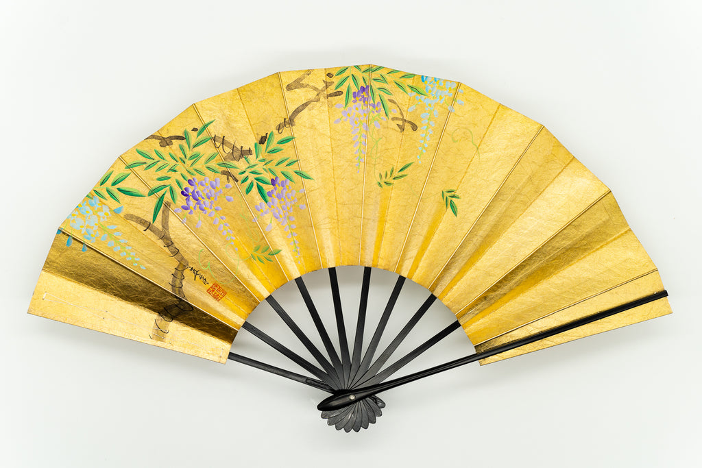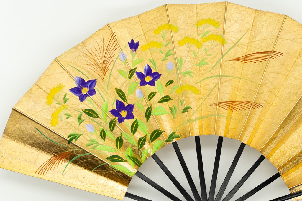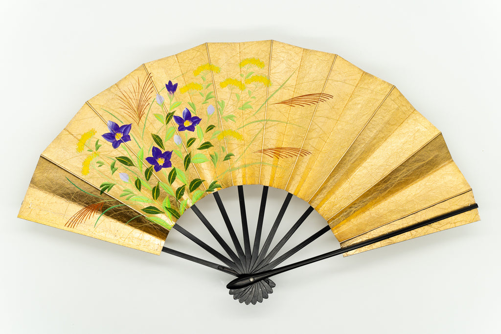 【一点もの・ビンテージ品】金箔を手で揉みこんで扇面に箔押した金もみ地に藤の花、もう片面には桔梗が描かれています。表と裏が違うデザインとなっており、雰囲気や季節に合わせて両面でお楽しみいただけます。
