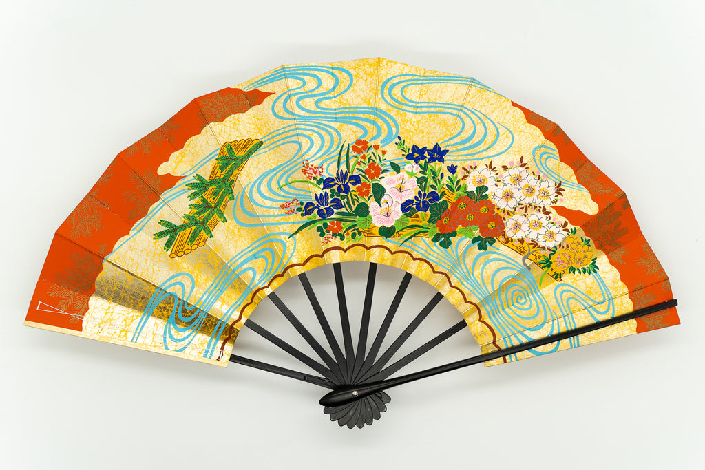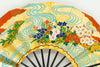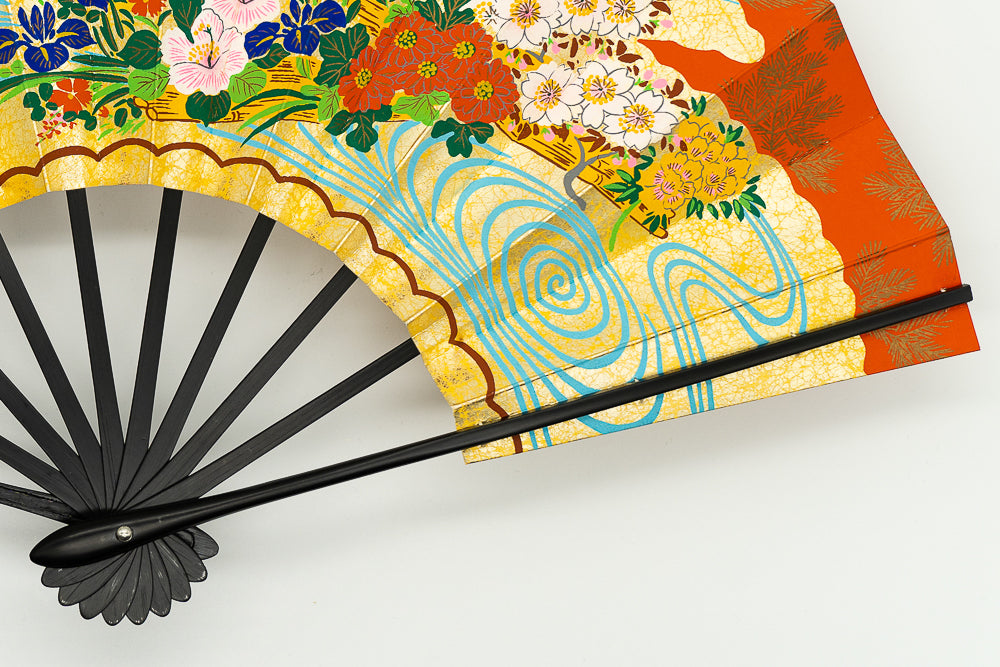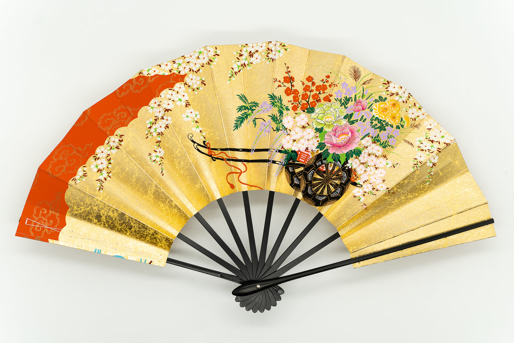 上質な金モミ地に色とりどりの花々を乗せた花車が描かれています。もう片面には花筏あしらわれ、流水がアクセントになっています。大変豪華で華やかな仕上がりとなっています。