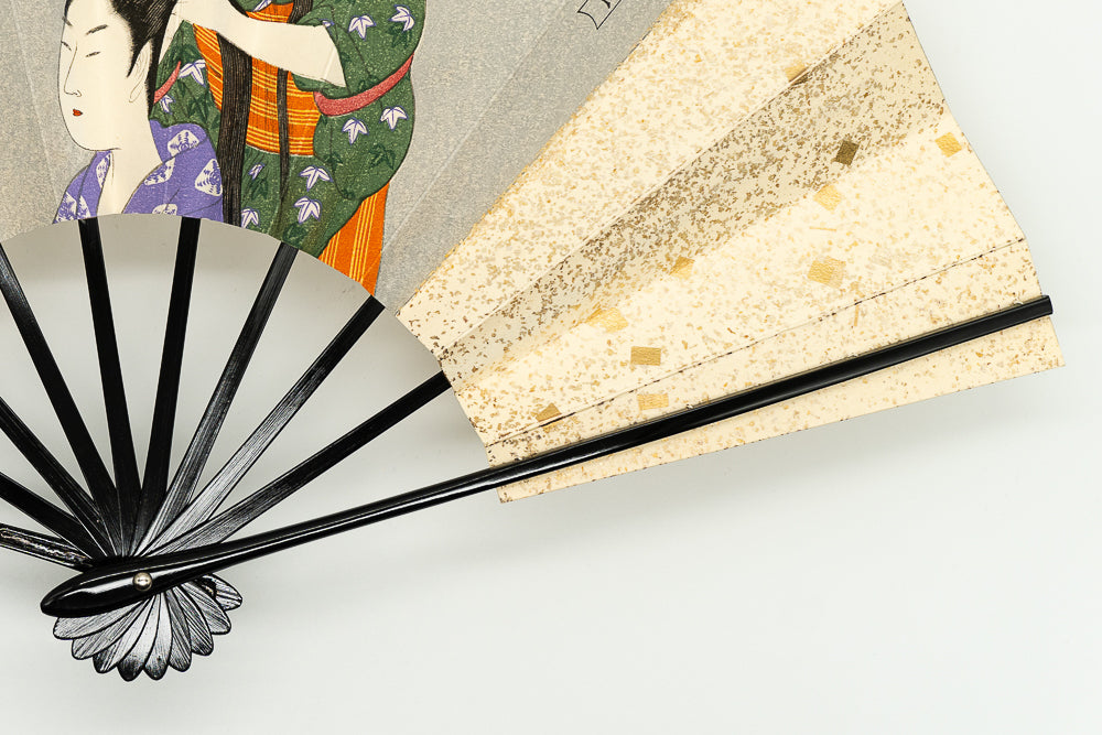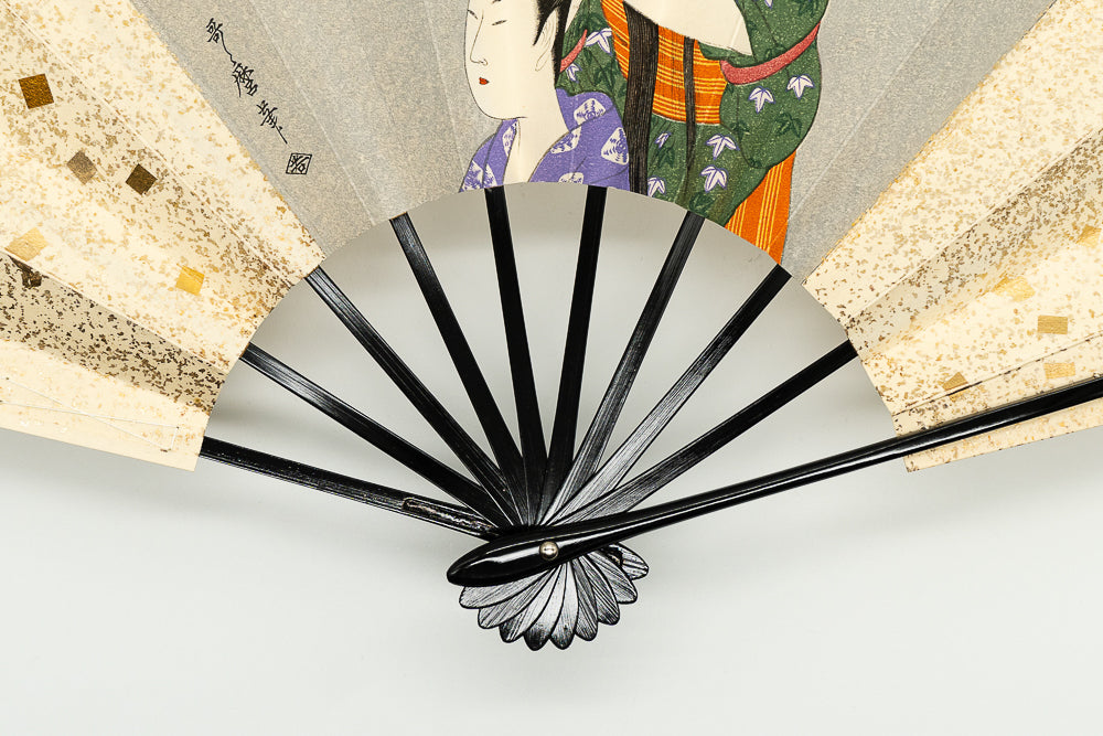 鳥の子地に金の小石砂子、北川歌麿の美人画が描かれています。一色一色を丁寧に刷り上げ、職人の手間暇が感じられる一品です。