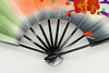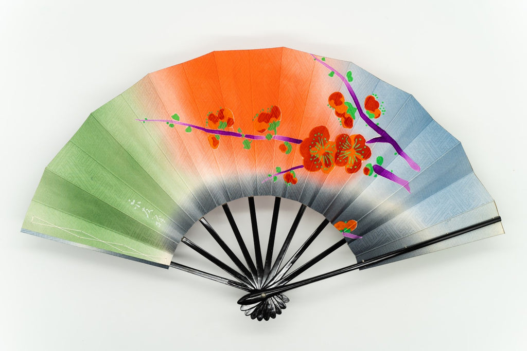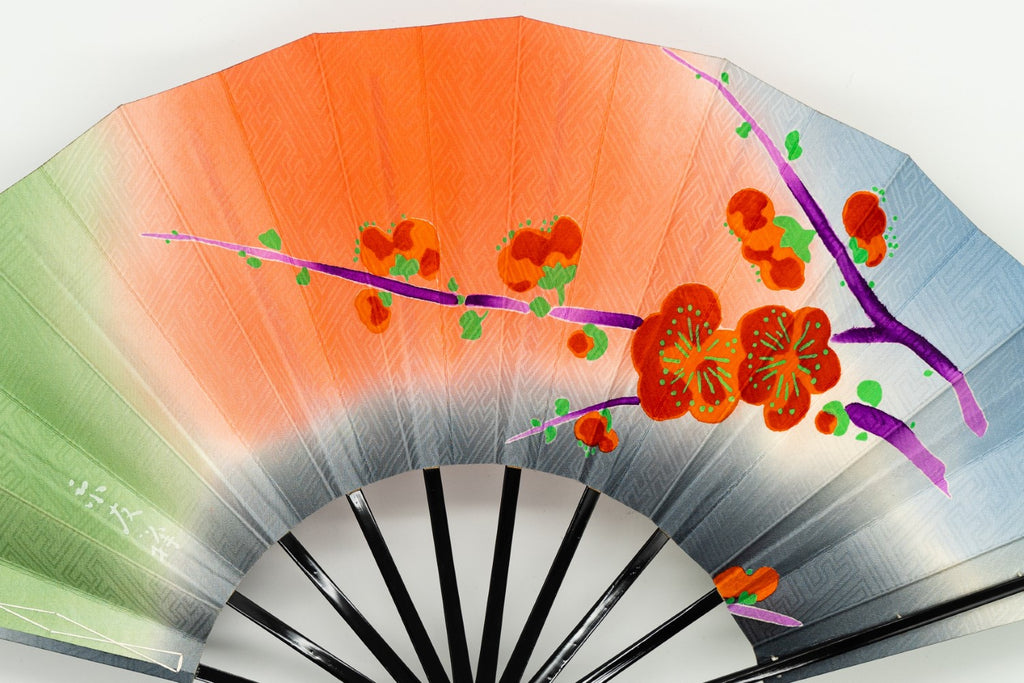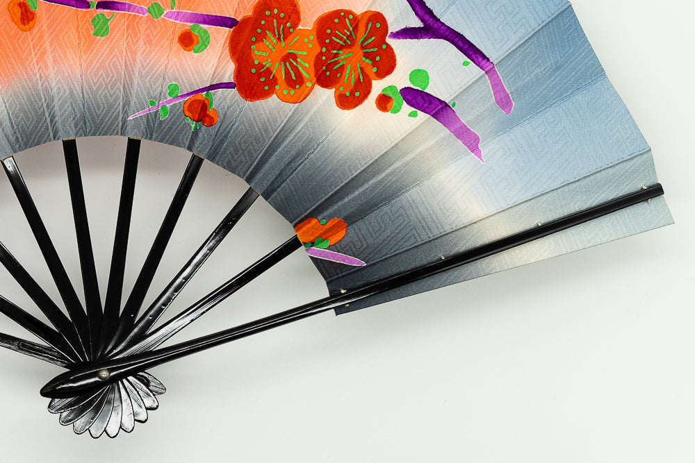 【一点もの】京友禅を扇に仕立てた珍しいお品です。鮮やかな色柄の梅がモダンな印象。布地ならではの質感と紗綾形(さやかた)文様がアクセントになっています。