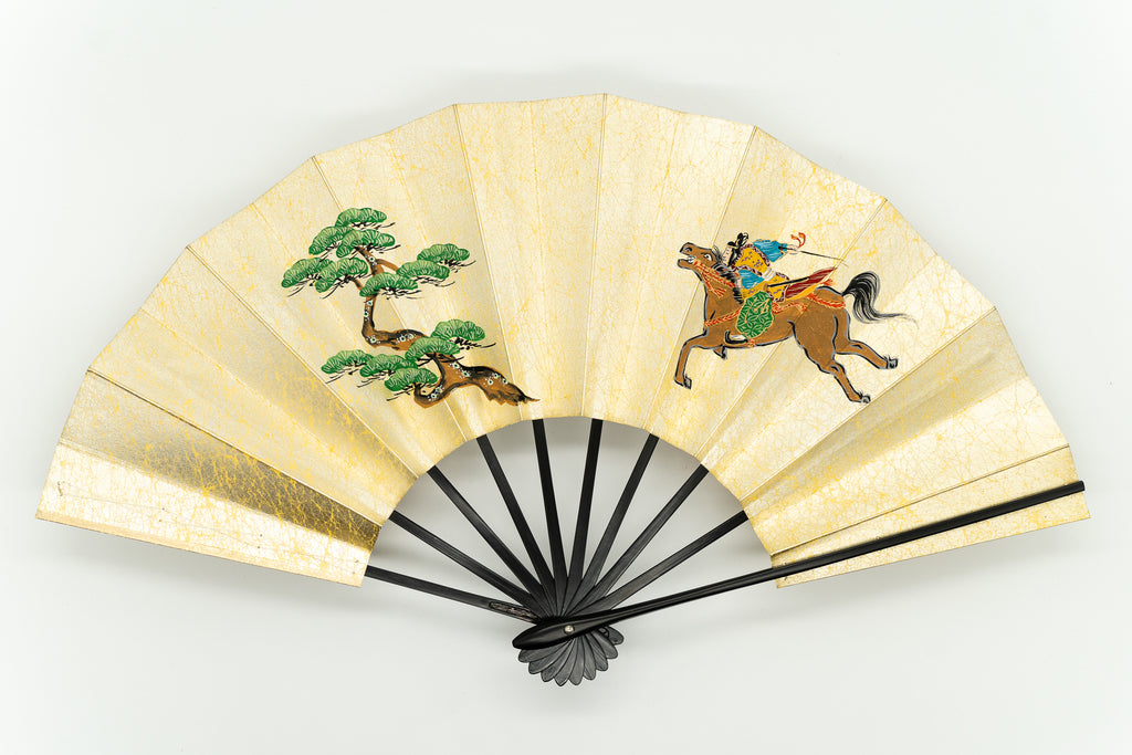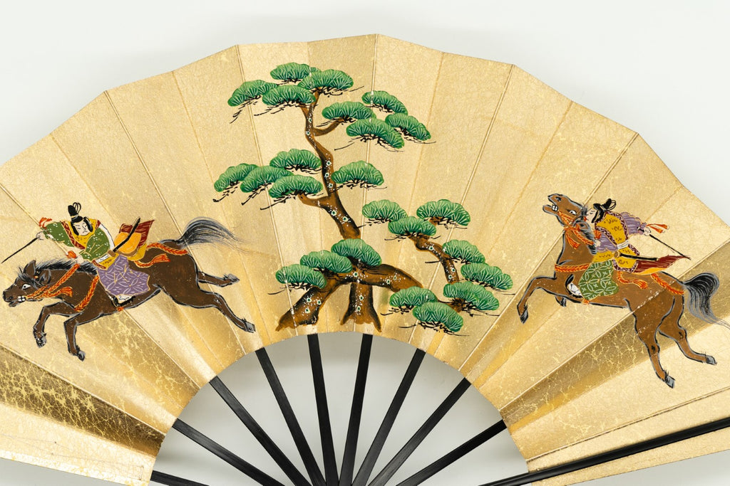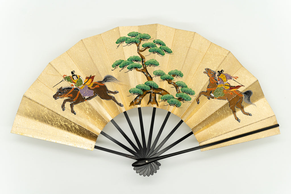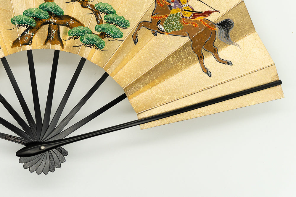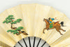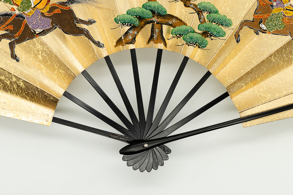 【ビンテージ】上質な金もみ地に古式競馬の様子が躍動的に描かれています。お扇子の絵柄としては珍しく手描きならではの味わい深さを楽しんで頂ける作品です。 色合い:金,茶,緑イメージ:古典デザイン・柄:人物,馬サイズ(長さ):29cmサイズ(広げた時の横幅):51cm