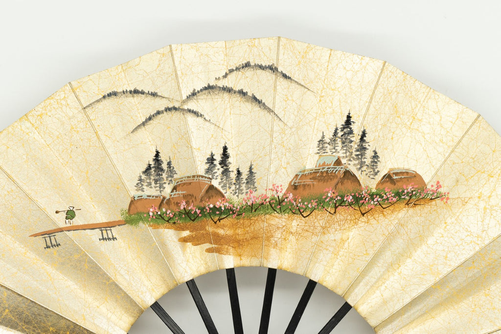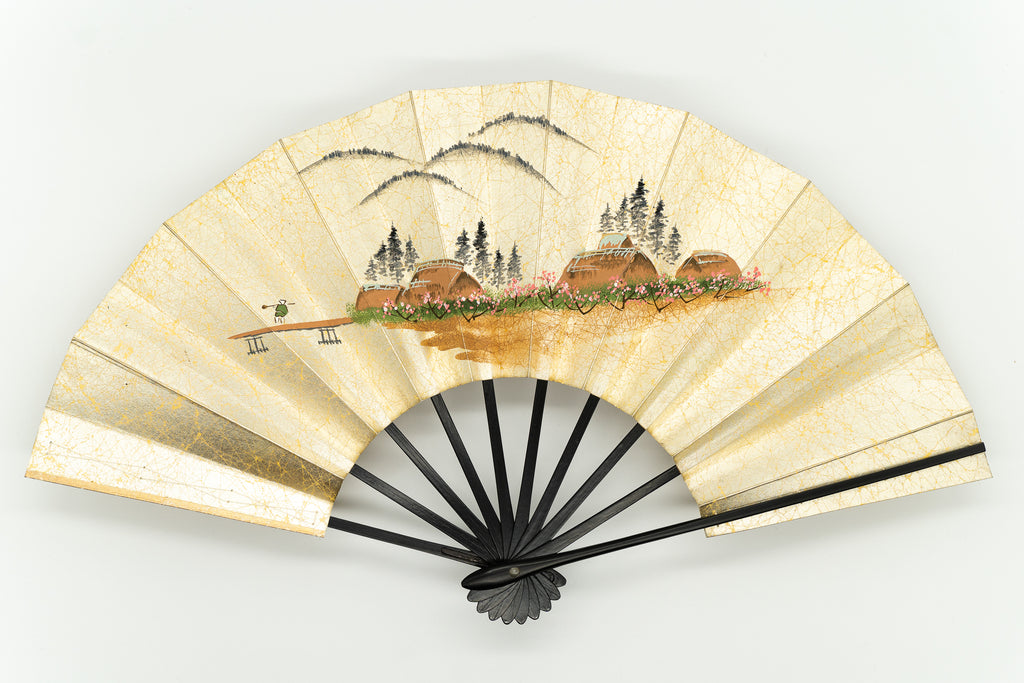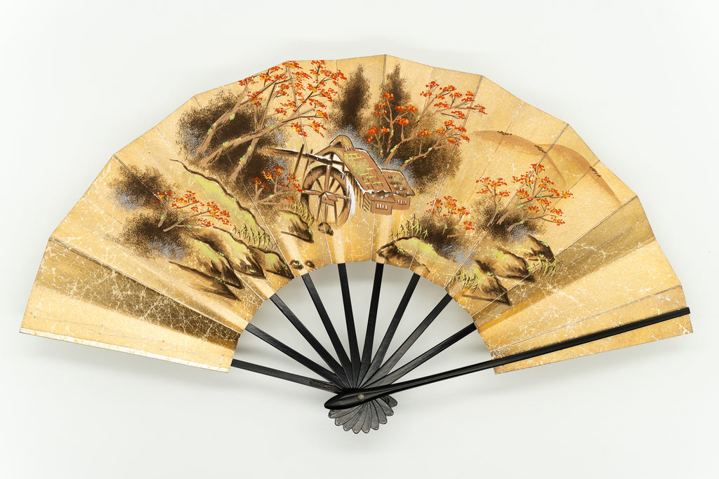 【一点もの】上質な金もみ地に秋の山里と水車小屋、もう片面には春の山裾の風景が描かれています。丁寧に絵付けされた手描きならではの味わい深さを楽しんで頂ける作品です。