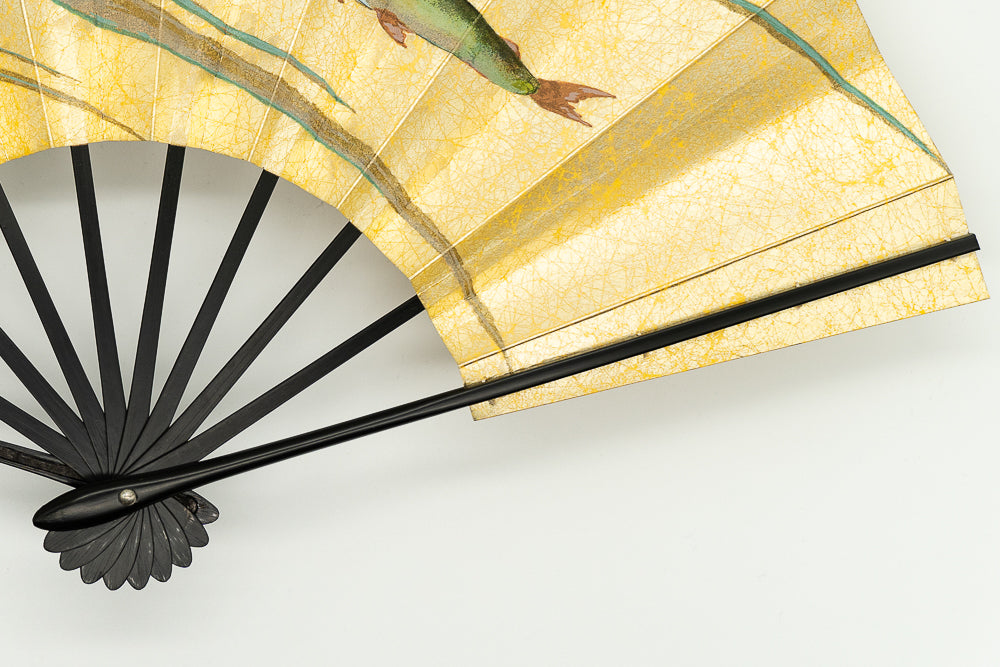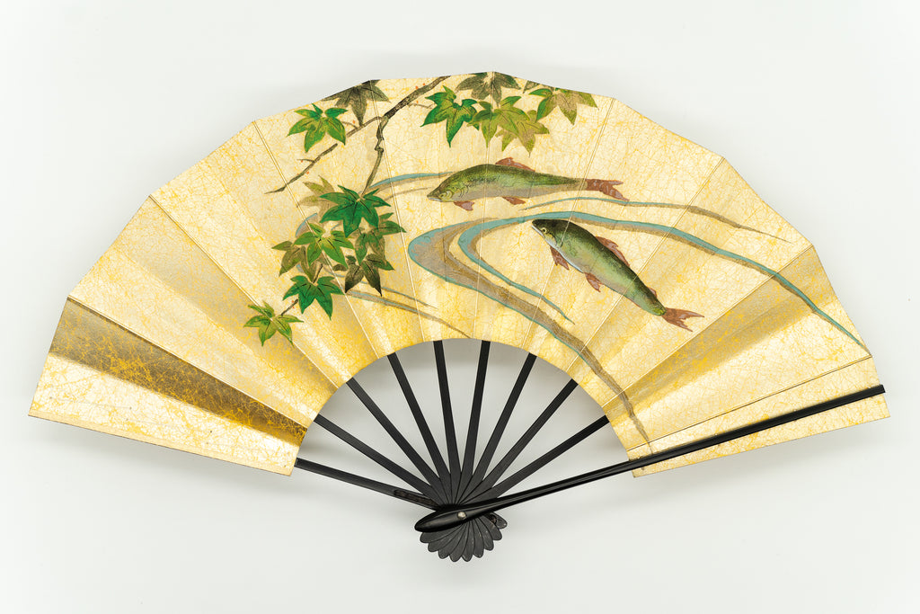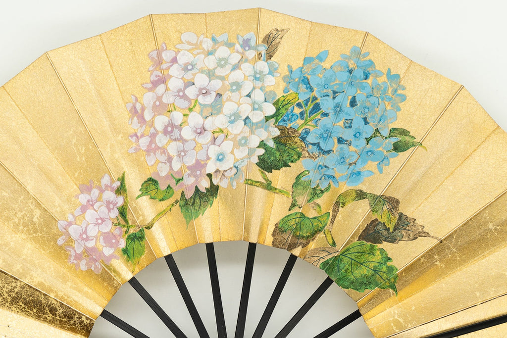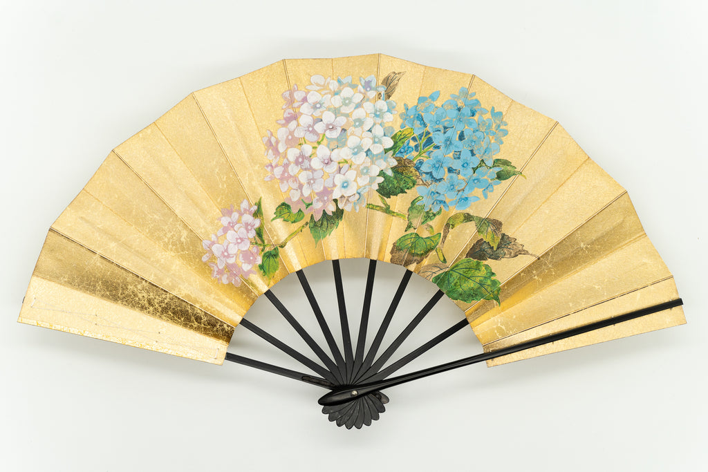 上質な金もみ地に柔らかな色調の紫陽花を手描きで絵付けし、エレガントな雰囲気に仕上がっています。もう片面には涼やかな鮎ををあしらい、両面お使い頂けます。 色合い:ピンク,金,青,緑イメージ:エレガント,古典デザイン・柄:紫陽花,鮎サイズ(長さ):29cmサイズ(広げた時の横幅):51cm