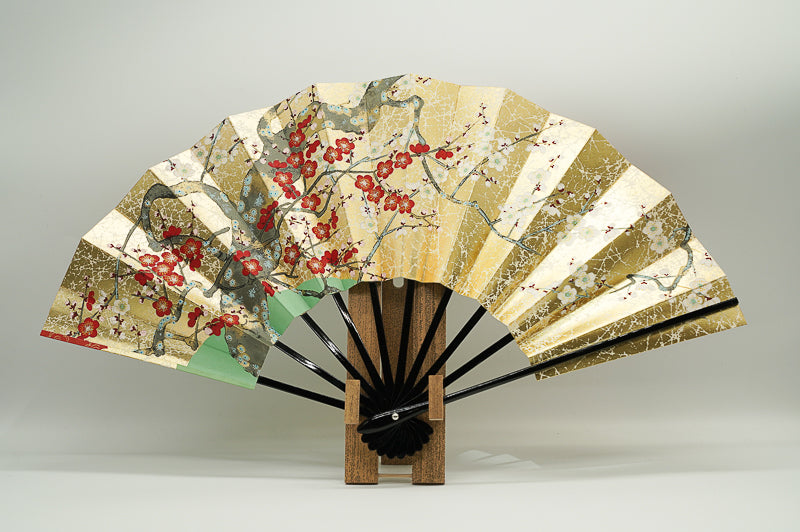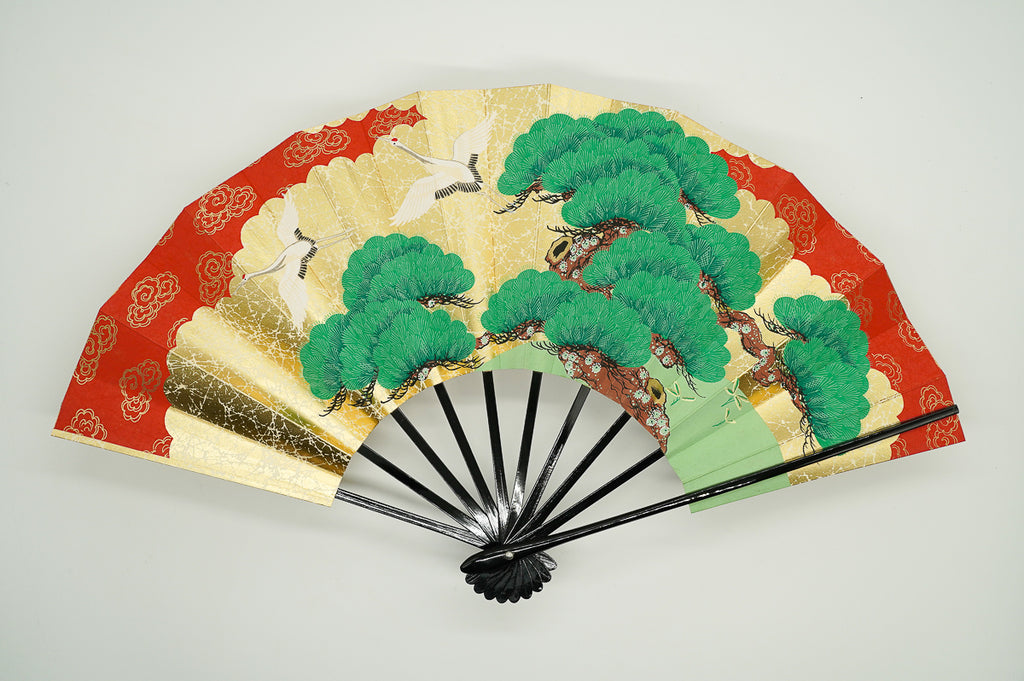 金もみ地の扇面に二羽の鶴と松、もう片面には紅白の梅が描かれています。お祝い事や贈物にもぴったりのデザインです。季節やお好みに合わせて両面お使いいただけます。