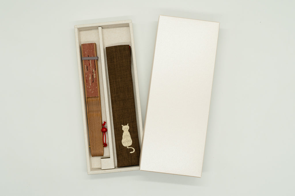 扇子ケースにはネコの後ろ姿を刺繍であしらいました。ネコちゃん好きの方にピッタリのセットです。